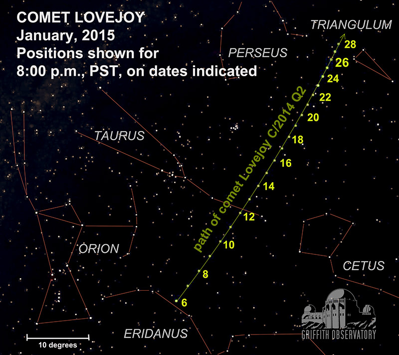 A comet discovered on August 17, 2014, by Australian astronomer Terry Lovejoy has brightened just in time for prime-time viewing in Los Angeles. Through the rest of January, Comet Lovejoy (C/2014 Q2) is expected to remain bright enough to be seen through ordinary binoculars in spite of the glow of city lights. It is also visible to the unaided eye from wilderness locations free from artificial lights.