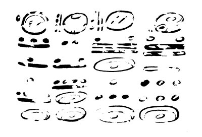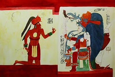 | Classic Maya murals of two Maya figures found at Xultun, in the Guatemalan rainforest. Illustration by Heather Hurst. | The number array above was found on the wall of a small room in a Maya ruin with the oldest known Maya astronomical tables. Composite image by William Saturno; drawing by David Stuart. |