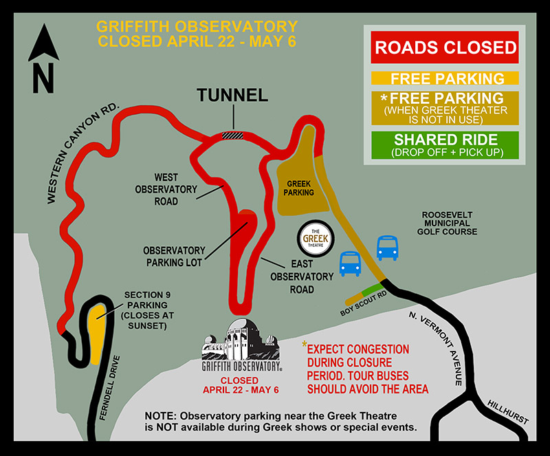 While the Observatory is closed, the closest parking will be near the Greek Theatre. However, on Greek Theatre show days (currently April 27, May 2, and May 3), no parking is available after 1:00 p.m. We suggest you avoid visiting the area on these days after 1:00 p.m.