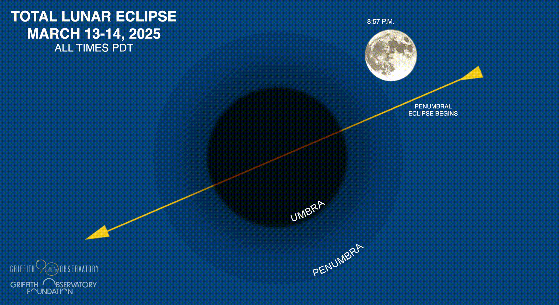 Griffith Observatory is hosting an online broadcast of the total lunar eclipse on March 13 from 8:50 p.m. – 3:05 a.m., PDT. Griffith Observatory is NOT conducting onsite public viewing. Griffith Park will NOT be open during the broadcast. The Observatory will stream the eclipse live online, weather permitting.