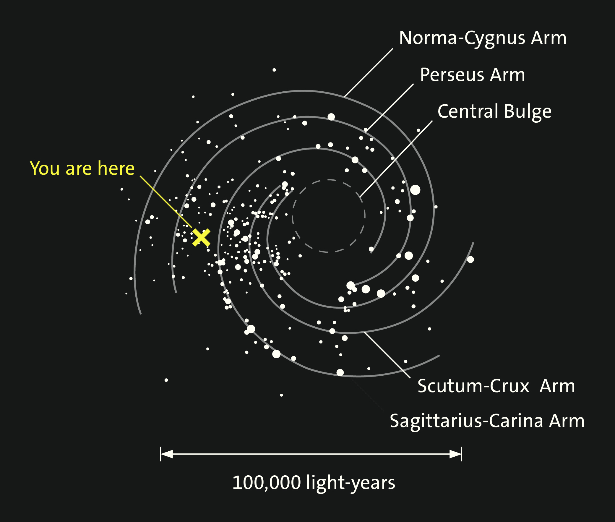 Our solar system is some 26,000 light-years from the Milky Way’s center. Star-forming regions full of bright blue stars only a few million years old are arrayed along the spiral arms.