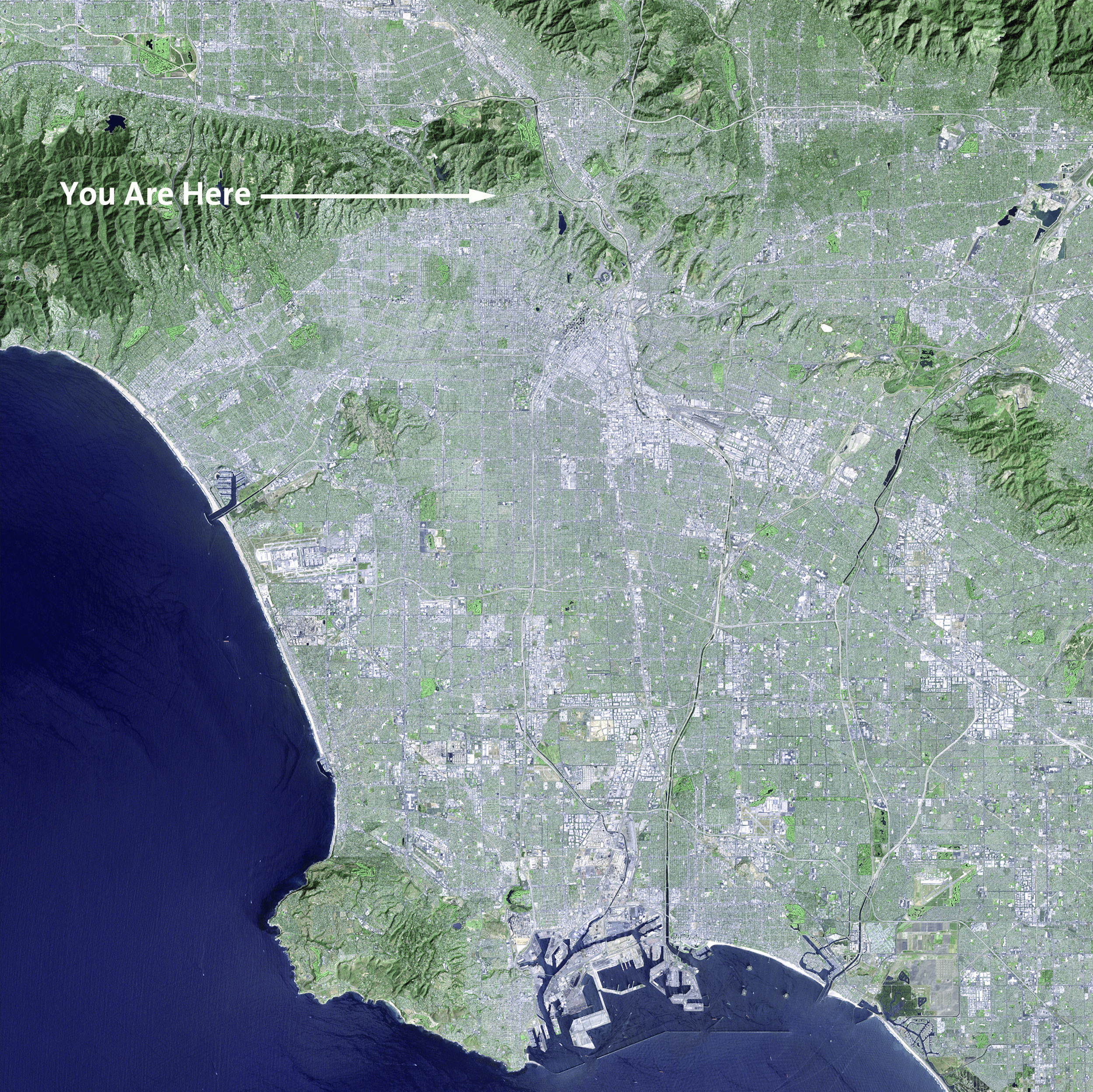 This corner of the universe is a mix of natural geographic features and structures that we have built. Roads, bridges, and buildings punctuate the hills, rivers, forests, and beaches. Griffith Observatory is just a small speck of white on the Hollywood Hills.
