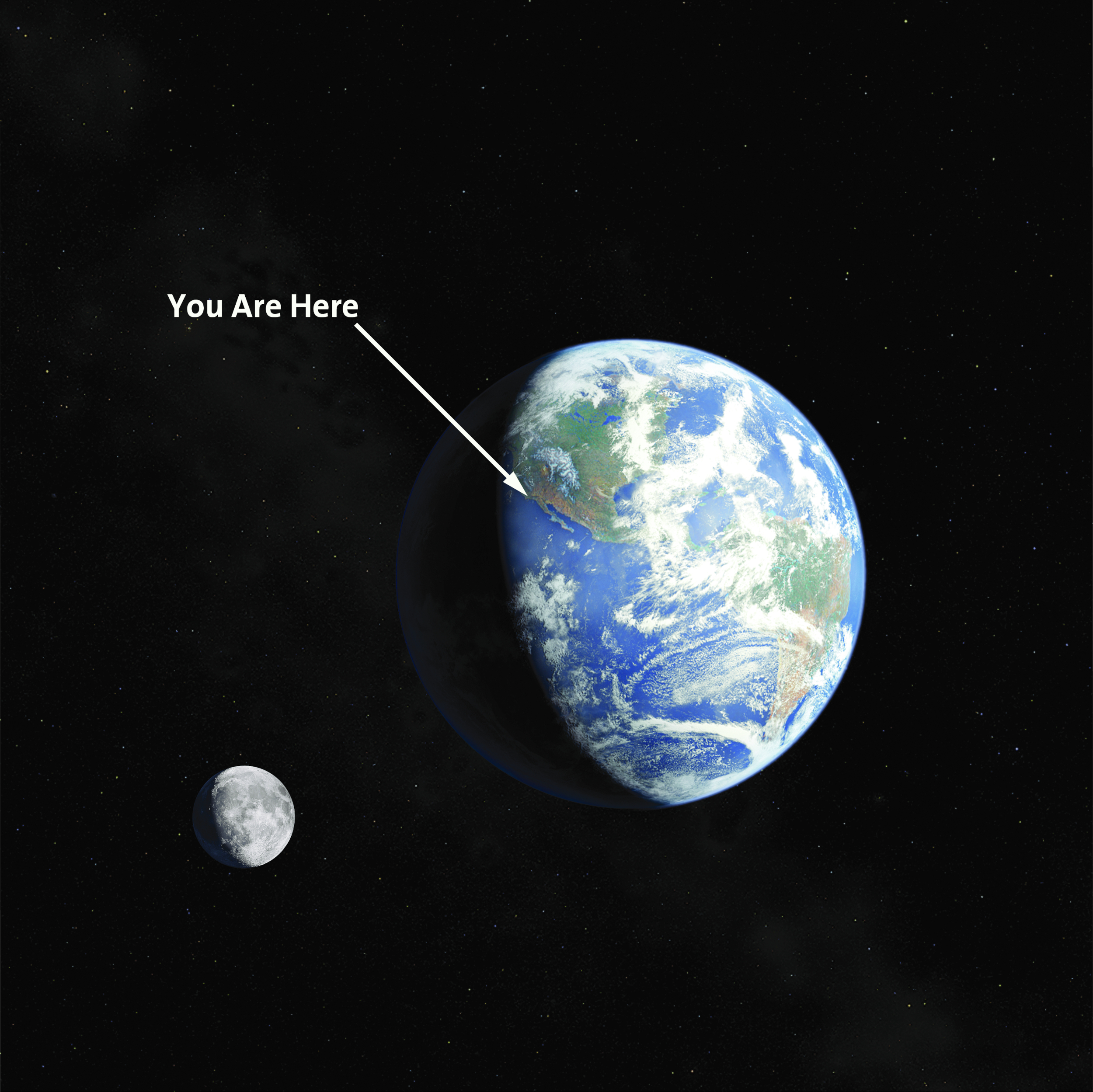 Our home planet is a small, rocky world enveloped by a life-sustaining atmosphere. Roughly two-thirds of its surface is submerged in water. The rest is divided into mountains, plains, and deserts. Our closest neighbor in space is the Moon, a lifeless, barren place roughly one-quarter Earth’s diameter.