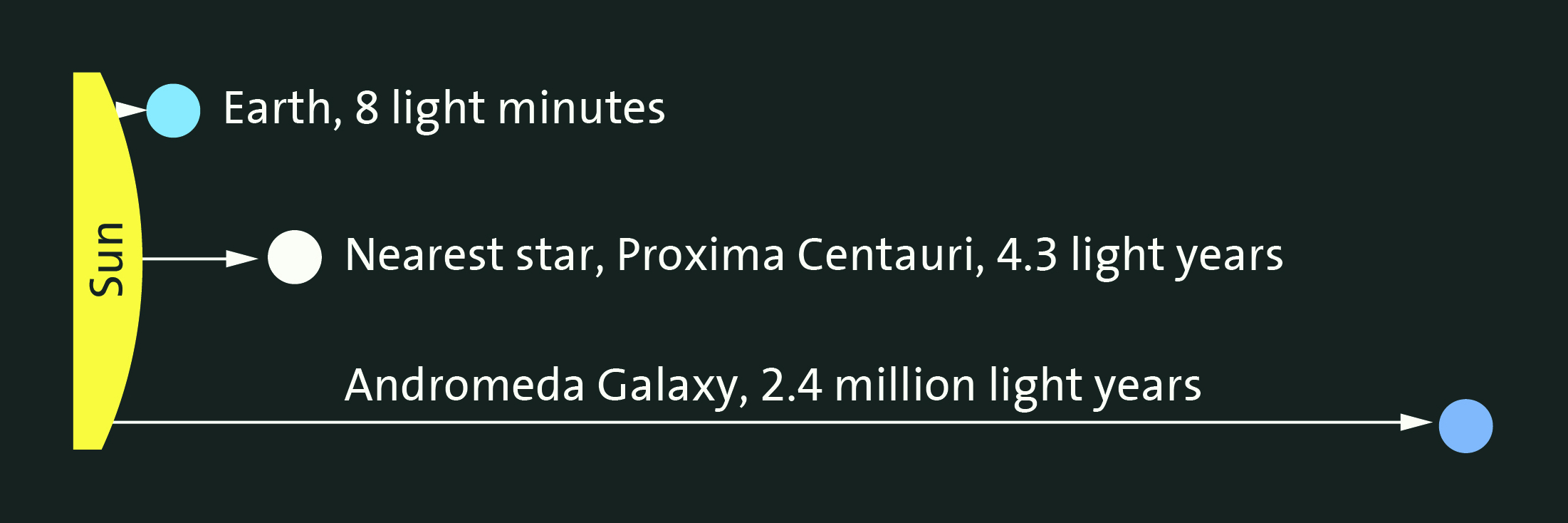 The distance from Earth to the nearest star is about 25 trillion miles (40 trillion km). The nearest galaxy lies much farther across empty space. At this scale, miles or kilometers are impractical ways to measure distance, so we use the light-year. This is the distance that light travels in a year: 5.8 trillion miles (9.3 trillion km).