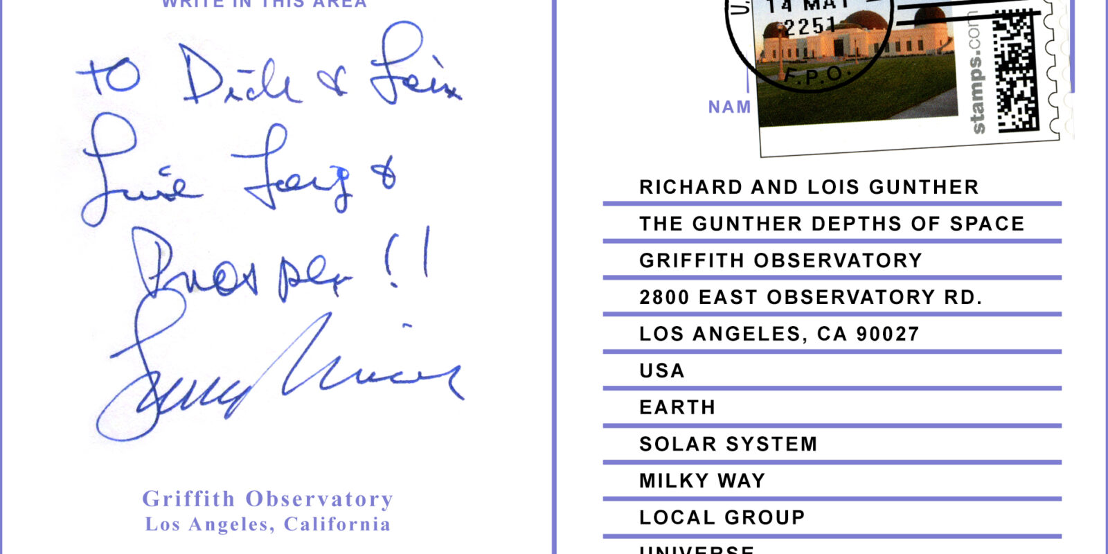 A postcard with a cosmic address needs more information than usual. Each line represents the organization of objects in the universe, from small to large, near to far. We begin with our familiar coordinates on Earth and move out through the solar system to the most distant galaxies in the cosmos. Today we understand enough about the structure of the universe to know our complete address.