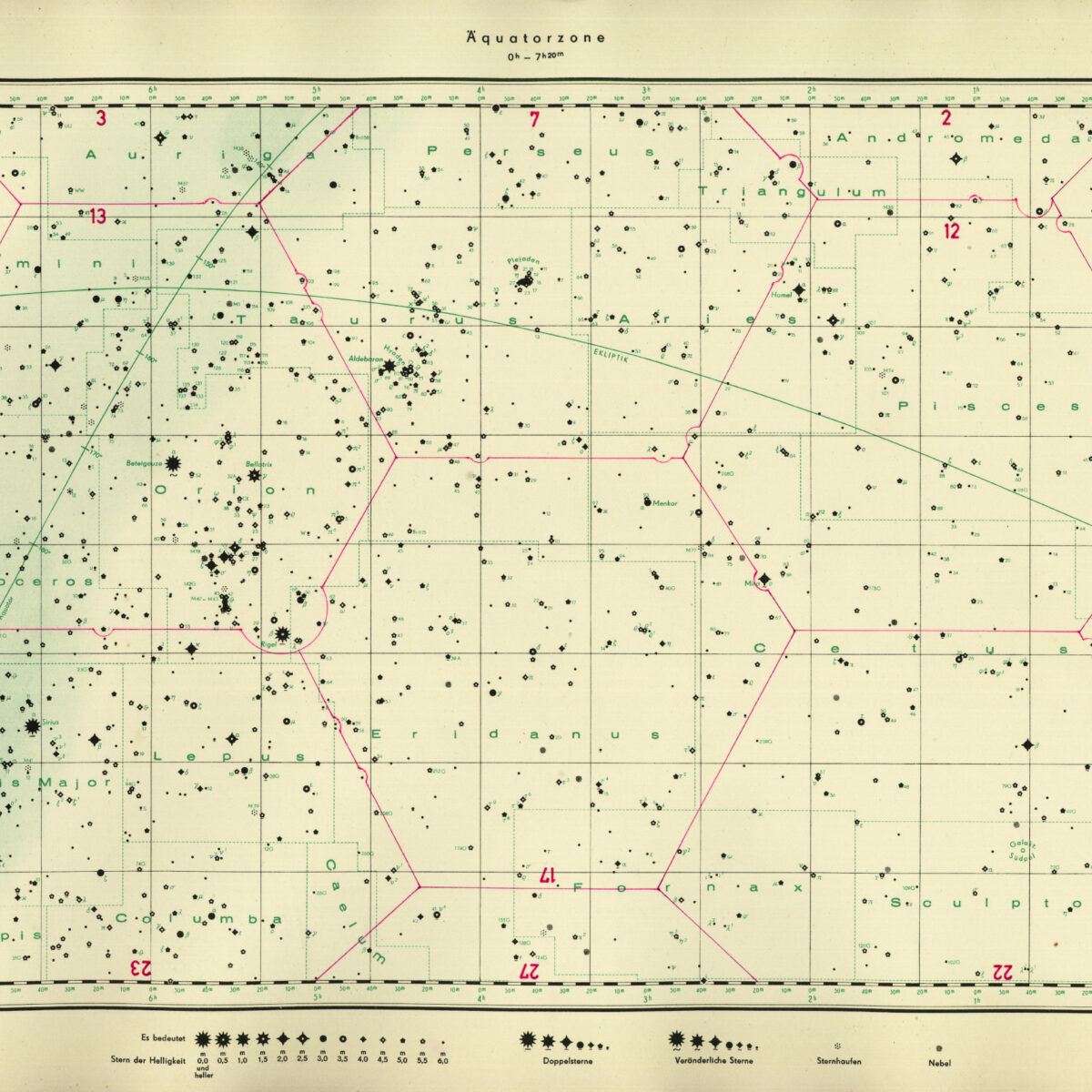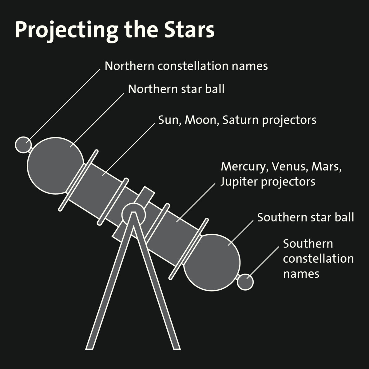 A pair of thousand-watt lamps in the star balls of this Zeiss planetarium instrument projected light onto 32 plates. Each was perforated with one hole for every star’s position, plotted from a precise celestial map like the one here and on the wall in front of you. Stars were then projected onto the dome by lenses. Instruments inside the central cage produced the Sun, Moon, and five of the planets.
