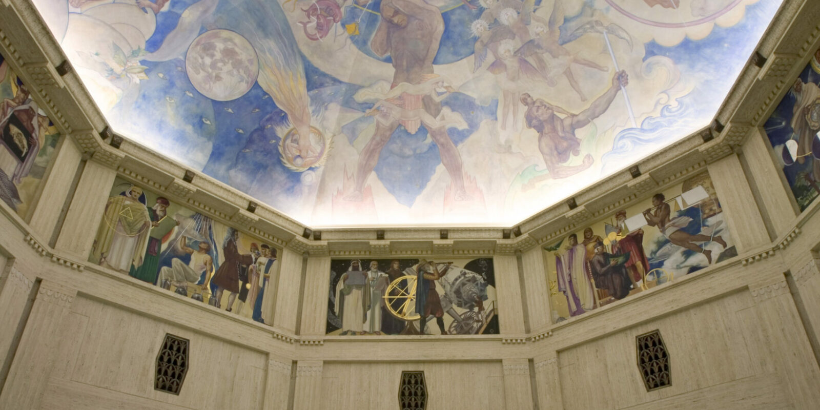 On the vaulted ceiling and upper walls of the W. M. Keck Foundation Central Rotunda are Griffith Observatory's greatest artistic treasure: the Hugo Ballin Murals. Workers have carefully and completely restored the murals so that they appear as they did when first painted by muralist, film producer, and author Hugo Ballin in 1934.
