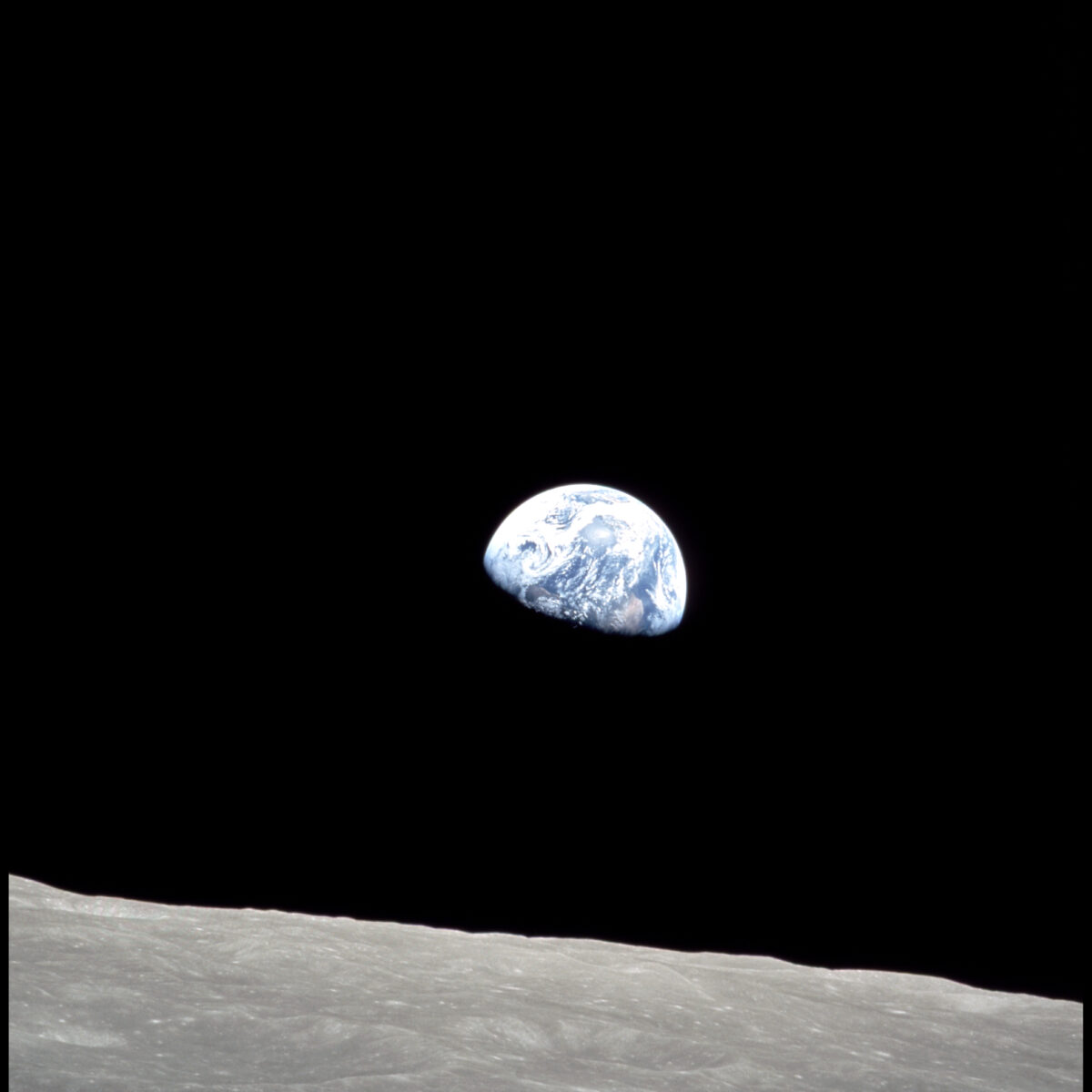 The first people to orbit the moon, the crew of Apollo 8, captured an image of Earth rising above the barren horizon of the Moon on December 24, 1968, that delivers a cosmic perspective of our home planet. Africa is visible at the lower edge of the Earth along the line marking the sunset, and the Atlantic Ocean is centered. (Apollo 8/NASA)