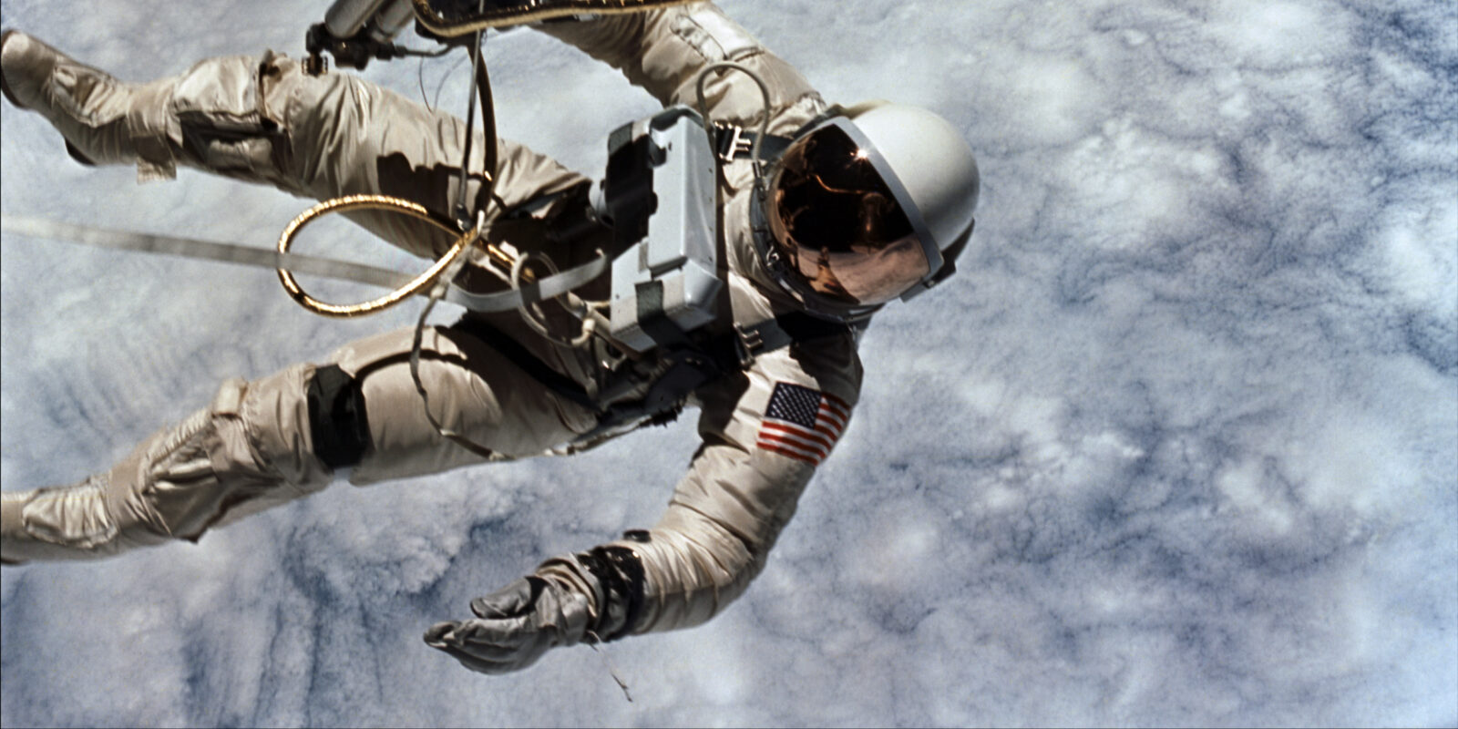 Edward H. White II becomes the first American to walk in space, 100 miles above the Earth, during the Gemini IV mission on June 3, 1965. White uses a small hand-held rocket to maneuver during his 21-minute space walk. A gold-wrapped 23-foot tether prevents him from drifting away and provides White oxygen and communications. His capsule is reflected in his gold visor. (James A. McDivitt/NASA)