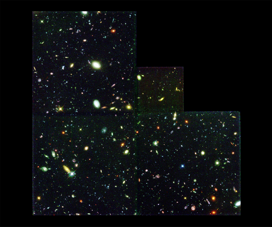 The resulting visible-light Hubble Deep Field image (left) is stuffed with galaxies. Many are so far away that they appear as they did when the universe was only a billion years old.