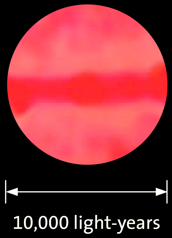 The microwave universe looks very different from what we see with our eyes. The Milky Way Galaxy appears as a bar of hazy light emitted by warm dust clouds. This dust gives off heat, which our spacecraft detect as microwave radiation. Beyond the galaxy, all of space is permeated by a microwave glow left over from the Big Bang that created the universe.