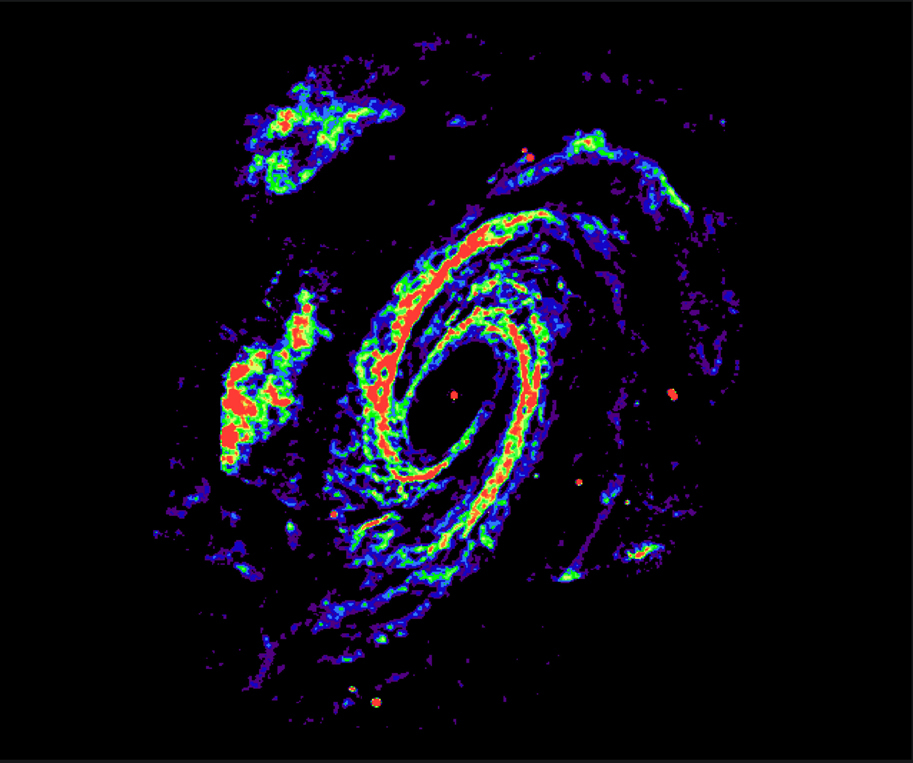 Hydrogen is an important ingredient needed to form new stars. The bright colors in this image are areas where cold hydrogen gas is plentiful in the spiral arms. These gas-rich regions could become stellar nurseries.
