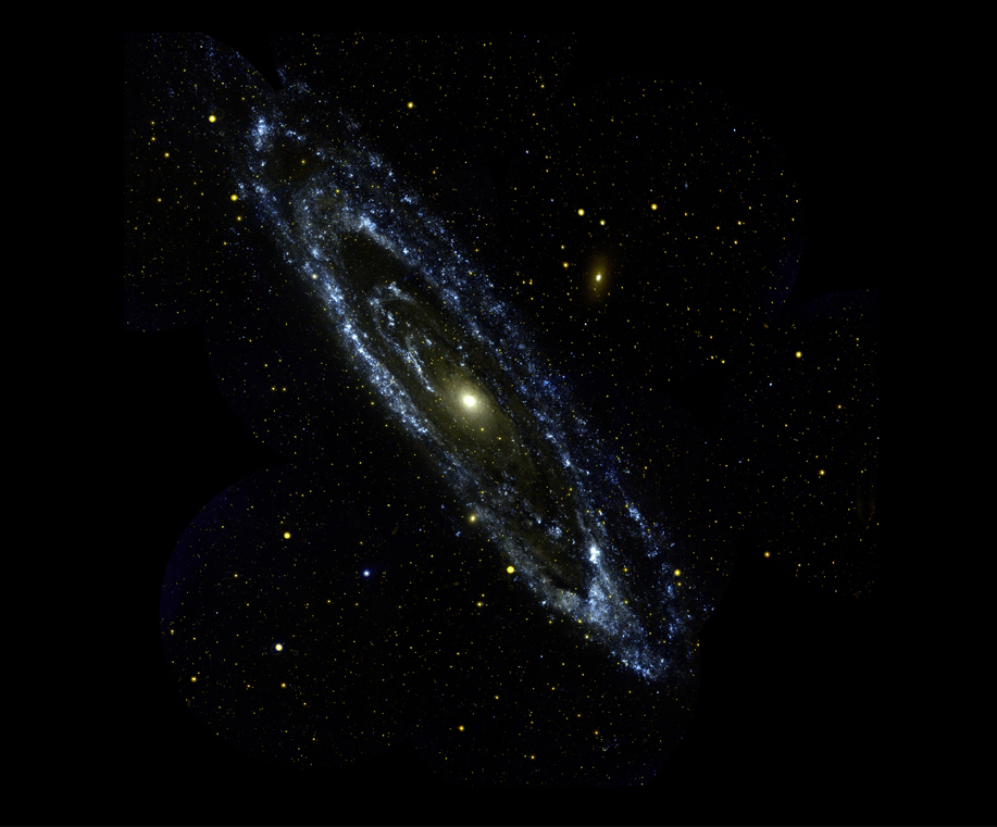 Star birth is an energetic activity. It gives off huge amounts of ultraviolet radiation. The Galaxy Evolution Explorer’s image of the neighboring Andromeda Galaxy (left) shows great waves of star formation in its spiral arms.