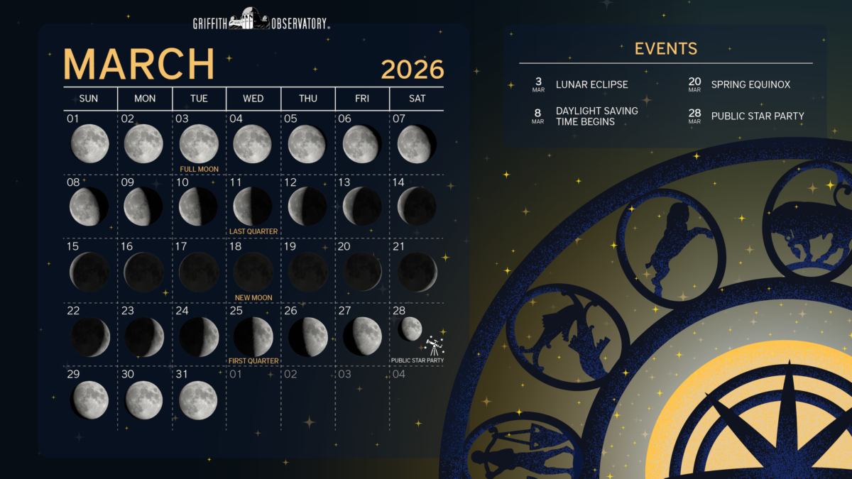 This is the Griffith Observatory Sky Report for the period between March 1 and March 31, 2026. Here are the events happening in the sky of southern California.