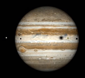 A rare celestial event took place on Friday night, January 23, 2015, when the shadows of three of Jupiter’s four largest moons – Io, Europa, and Callisto – fell upon Jupiter at the same time.
